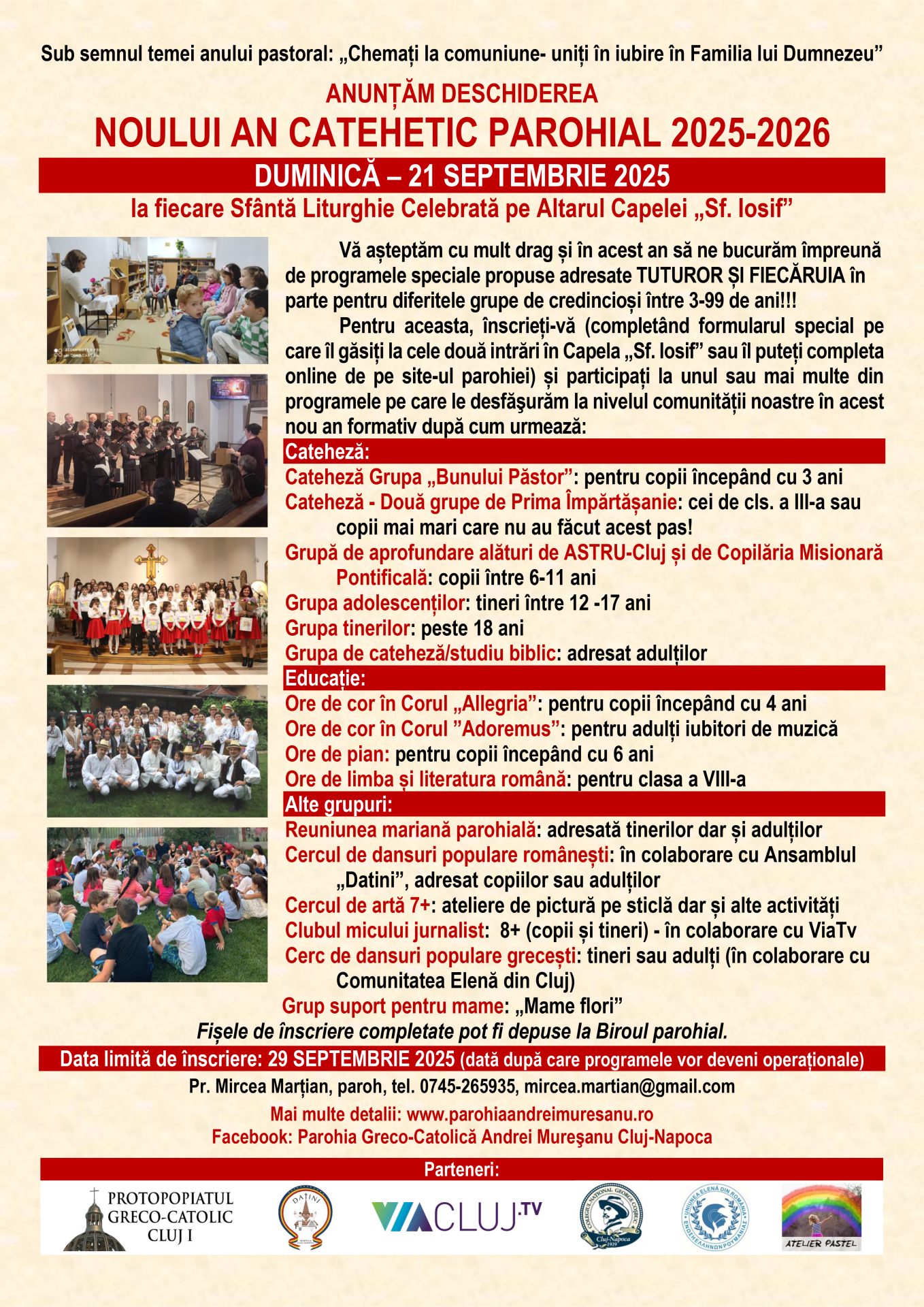 Cu inimile pline de recunoștință și speranță, vă invităm să ne bucurăm împreună de deschiderea noului an catehetic-misionar 2025-2026, în comunitatea noastră din inima Clujului.